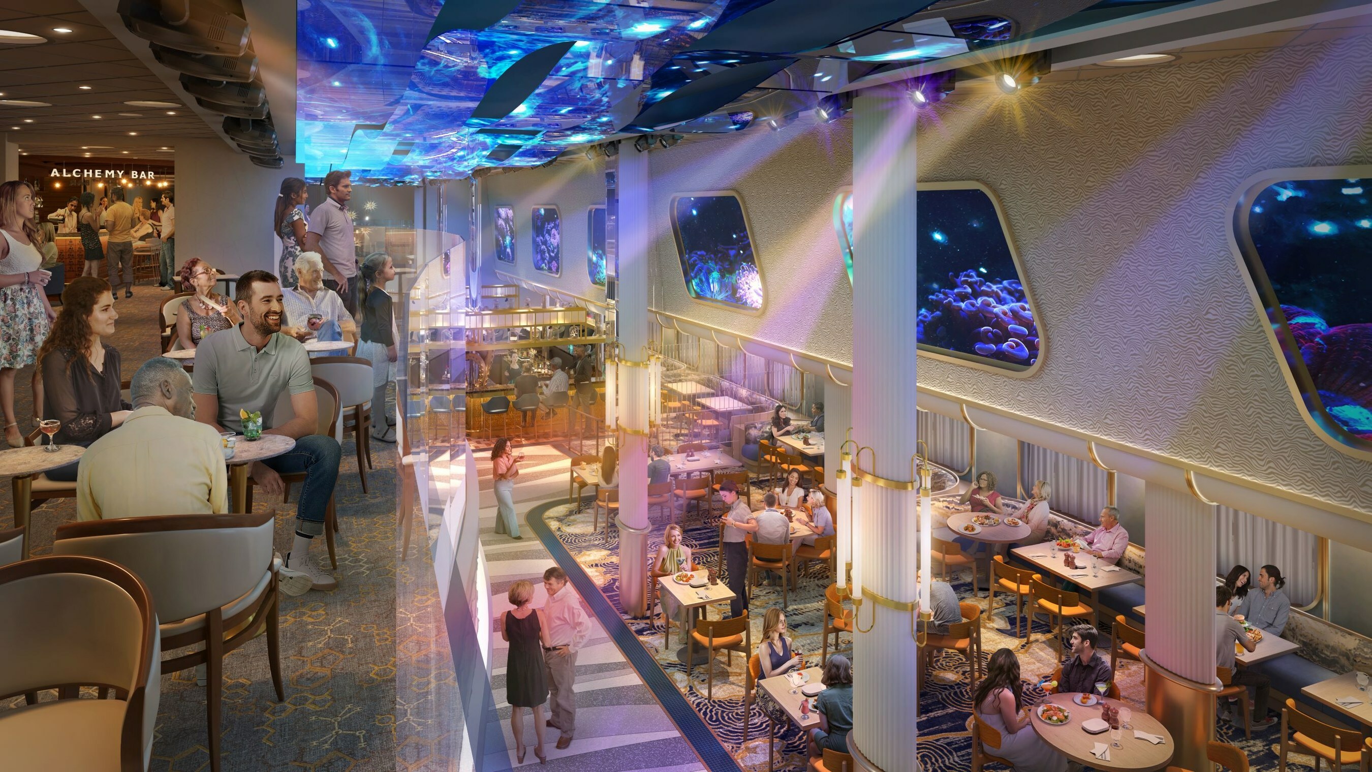 Currents, encompassing Deck 6 and Deck 7, is an awe-inspiring, immersive and transformative space that takes guests below the waves with a playful vibe featuring innovative technology, new and exciting bar and dining venues and live music. When guests step into Currents, they will be transported to mesmerizing underwater worlds, both realistic and fantastical, in a beautiful space that changes from day to night and throughout the cruise. The portals to the sea comprise six huge LED windows which, along with a massive wave-shaped LED ceiling, theatrical show lighting and captivating sound design will create a variety of immersive environments for guests to enjoy as they try new, unique cocktails and flavorful dishes. Venues within Currents include: