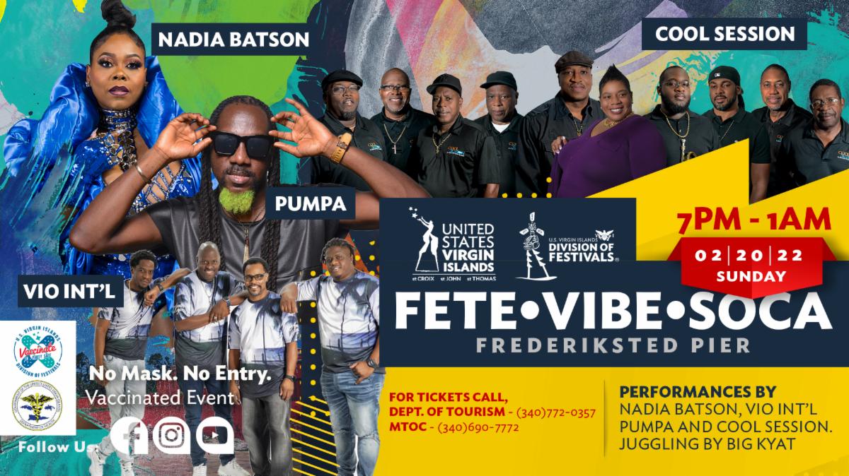 The outdoor action takes place Sunday, February 20, 2022, at the Frederiksted Pier from 7 p.m. until 1 a.m. and features Virgin Islands star performers Cool Session Brass, Pumpa, VIO International and DJ Big Kyat.