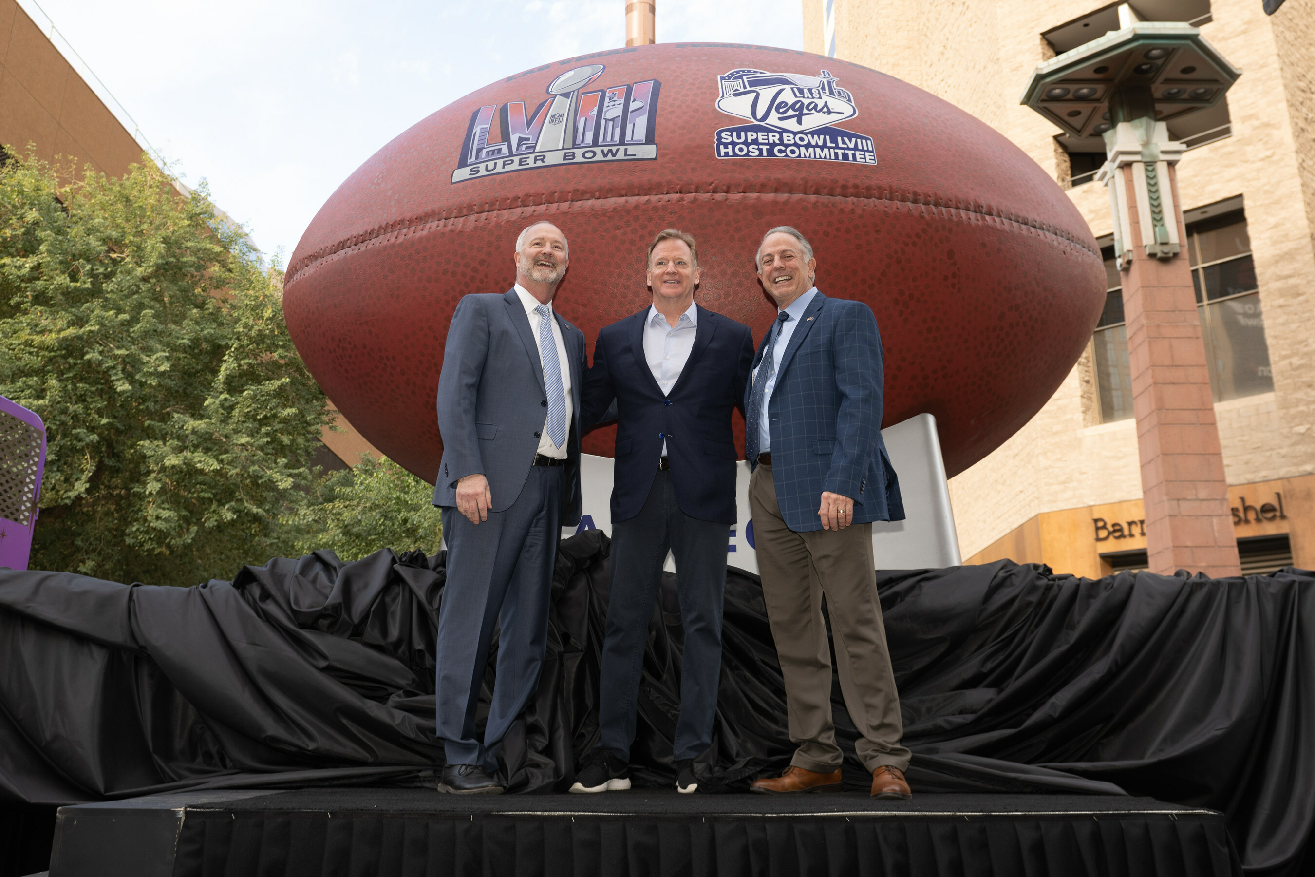 Following the handover press conference, Las Vegas unveiled the larger-than-life Super Ball, which is symbolic of the excitement the first-ever Super Bowl in Las Vegas. Featuring the official logos of Super Bowl LVIII and the Las Vegas Host Committee, the ball measures 13 feet long x 8 feet in diameter and weighs almost 1,200 pounds.