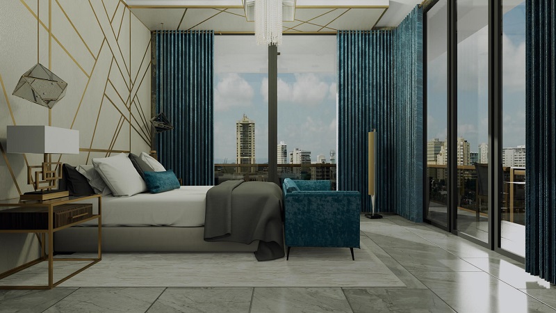 The design for the O:LV Fifty Five will be sleek and stylish, with film noir-influenced art and black and marble floors. Art Deco touches include neutral colors and brass geometric details, accented with plush furnishings in bright turquoise or purple.