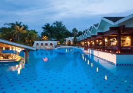 The junior suites feature connecting rooms, two full baths and a balcony or patio; the master bedroom includes a king bed and two trundle daybeds, and the second bedroom has two double beds.