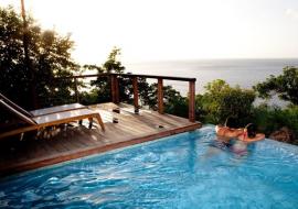 The one-bedroom villas include two decks, an elevated pool directly accessible from the bedroom, an outdoor shower, a barbecue and a hammock sofa.